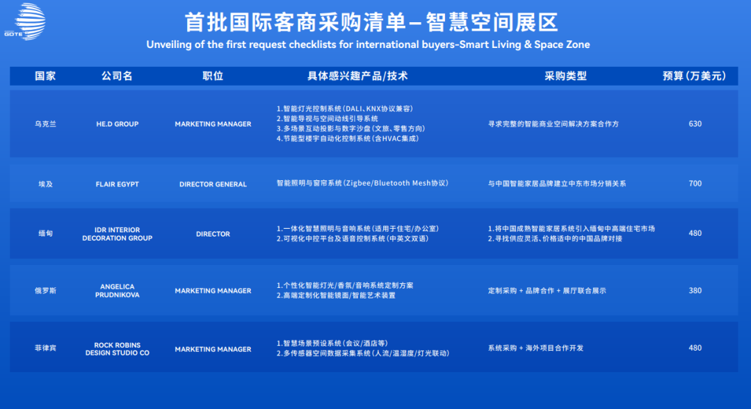 活动同期,首批海外客商采购需求发布。来自美国、英国、意大利、加拿大、澳大利亚、沙特、俄罗斯、马来西亚、泰国、越南、柬埔寨、印度尼西亚、缅甸、菲律宾等23个国家的客商在智慧空间领域寻求合作与采购,部分采购清单需求如下: