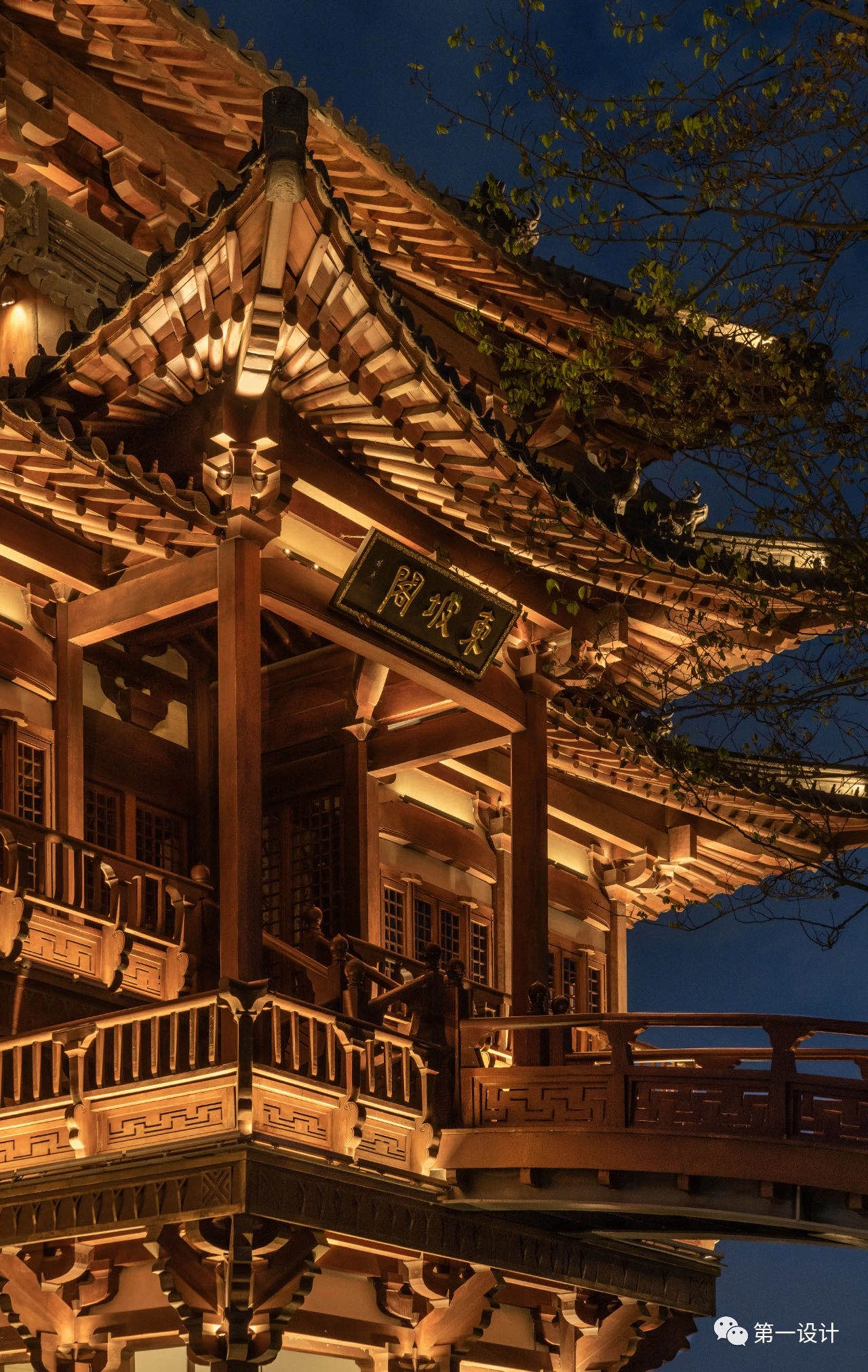主阁的飞檐、凭栏、屋脊、梁架、斗栱、匾额略施微光,使之透出静谧而素雅的禅光,用舒缓的灯光语言凸显古建的形制特点及上等木料的原色。
